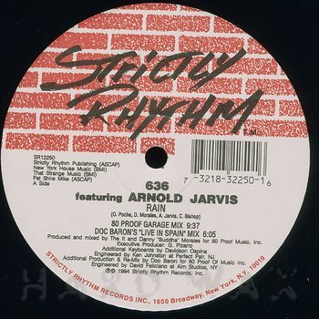 12"— out of stockStrictly Rhythm 12250Label Catalog636 feat. Arnold Jarvis: Rain1994 NYC House classic. One NM copy. A1 Rain (80 Proof Garage Mix) A2 Rain (Doc Baron's "Live In Spain" Mix) B1 Rain (80 Proof Mental Instrum Mix) B2 Rain (Doc Baron's Radio Edit)