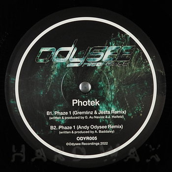 12"— out of stockOdysee R 005Label CatalogPhotek: Phaze 1 (Remix & Remaster)Repress of mid 1990s Drum & Bass gem reissued w/ contemporary remixes - one per customer A1 Phaze 1 (2022 Remaster) B1 Phaze 1 (Gremlinz & Jesta Remix) B2 Phaze 1 (Andy Odysee Remix)
