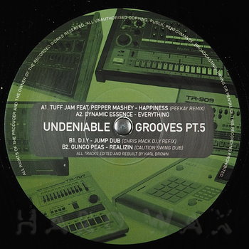 12"— out of stock2TUF-4U UNGV5Label CatalogVarious Artists: Undeniable Grooves Pt. 5Superb originalist UK Garage vibes A1 Tuff Jam feat. Pepper Mashey: Happiness (Peekay Remix) A2 Dynamic Essence: Everything B1 DIY: Jump Dub (Chris Mack D.I.Y Refix) B2 Gungo Peas: Realizin (Caution Swing Dub)
