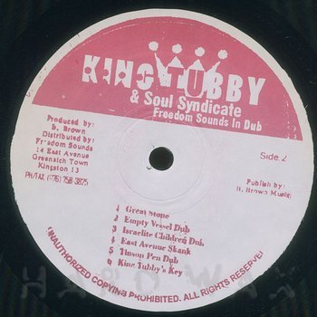 LP— out of stockFreedom SoundsReggae / A10King Tubby & Soul Syndicate: Freedom Sounds In DubGood Jamaican pressing of the KILLER Blood & Fire compilation, one mint copy A1 Ethiopian Version A2 Leaving Babylon Dub A3 Dub The Right Way A4 Salty Dub A5 Seaview Corner Rocking A6 Dub Of Righteousness B1 Great Stone B2 Empty Vessel B3 Israelite Children Dub B4 East Avenue Skank B5 Tinson Pen Dub B6 King Tubby’s Key