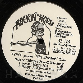 12"— out of stockRockin’ House 021Label CatalogTyree: The Dreams EP1994 percolating Chicago sample house trks & deep dreamy house A1 Stimpy’s Fave-O.Rite Song (Joy and Happy Mix) A2 Stimpy’s Fave-O.Rite Song (Happy Undaground Mix) B1 Dreams (Vocal) B2 Dreams (Dub) B3 Under Water (Instr.)