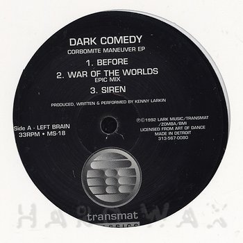 12"— out of stockTransmat 018Label CatalogDark Comedy: War Of The WorldsKenny Larkin prod. 1992 Detroit Techno (one sealed copy) A1 Before/ War Of The Worlds (Epic Mix)/ Siren B1 War Of The Worlds (Dark Room Mix) B2 Without A Sound (Right Brain Mix)