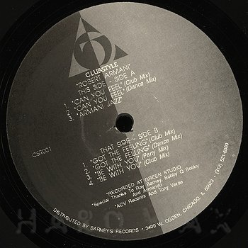 12"— out of stockClub Style 001Label CatalogRobert Armani: Can You FeelHard hitting Chicago house. sealed only copy avaible A1 Can You Feel (Club Mix) A2 Can You Feel (Dance Mix) A3 Armani Jazz B1 Got The Feeling (Club Mix) B2 Got The Feeling (Dance Mix) B3 Be With You (Party Mix) B4 Be With You (Club Mix)