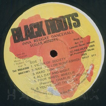 LP— out of stockBlack Roots BRLP 011Reggae / A32Sugar Minott: Inna Reggae DancehallOriginal Jamaican pressing, looks shitty, plays fine A1 Victim Of Society A2 Nah Follow Nuh Fashion A3 Hard Time Rock A4 All Day And Night A5 Four Wheel Wheelie (w / Charlie Chaplin) A6 You’ve Got The Love B1 War And Crime (feat. Jackie Lickshot) B2 Down The Line B3 Nuh Know It Like Me B4 Run Come B5 Rhythmatic B6 Inna Rab A Dub