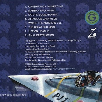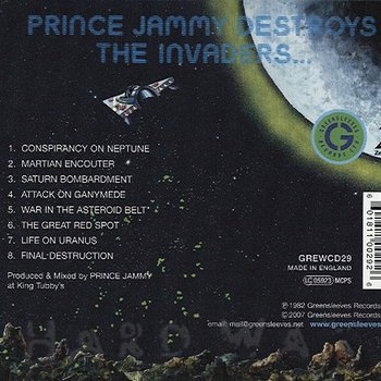 CD— out of stockGreensleeves GREWCD 29Reggae / A10Prince Jammy: Destroys The InvadersReissue of classic 1982 production w/ Roots Radics backing at King Tubbys 01 Conspiracy On Neptune 02 Martian Encounter 03 Saturn Bombardment 04 Attack On Ganymede 05 War In The Asteroid Belt 06 The Great Red Spot 07 Life On Uranus 08 Final Destruction