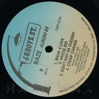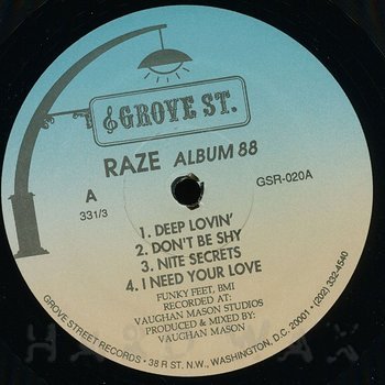 LP— out of stockGroove Street 020Label CatalogRaze: Album 88Vaughan Mason prod. 1988. mint condition. only one copy available A1 Deep Lovin’ A2 Don’t Be Shy A3 Nite Secrets A4 I Need Your Love B1 Break 4 Love B2 Whose Bed B3 Don’t Keep Me Guessin’ B4 Chump Change