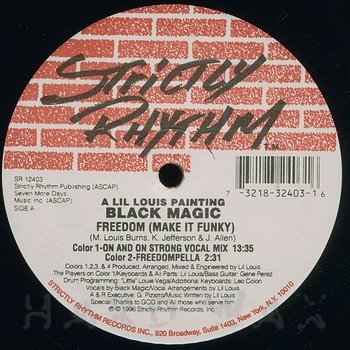 12"— out of stockStrictly Rhythm 12403Label CatalogBlack Magic: Freedom (Make It Funky)1996 NYC House classic. One NM copy. A1 Freedom (On And On Strong Vocal Mix) A2 Freedom (Freedompella) B1 Freedom (Lil Louis Zohz Sub Dub) B2 Freedom (Frankie's Dub)