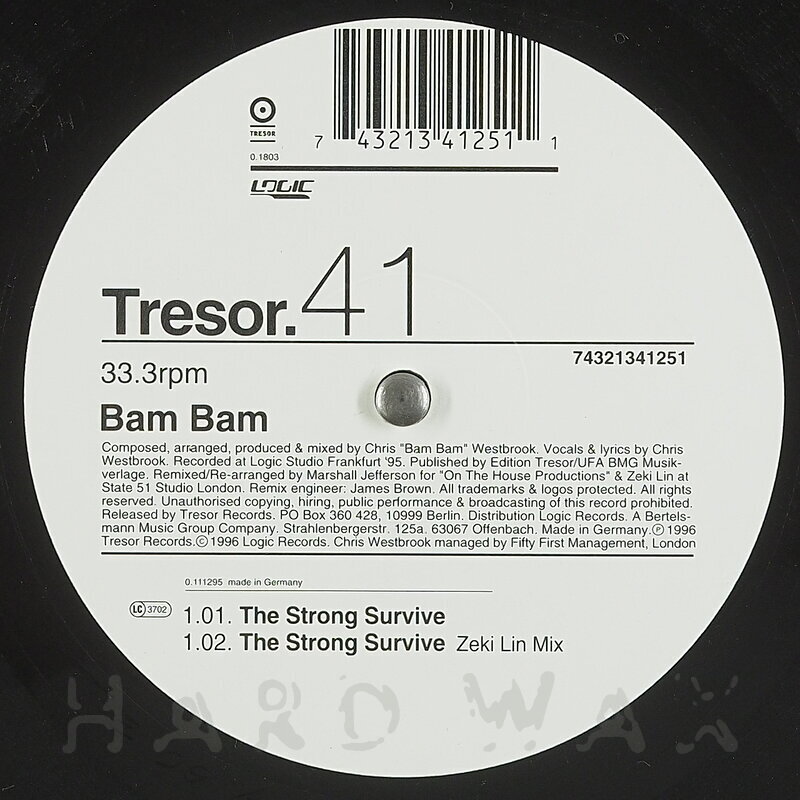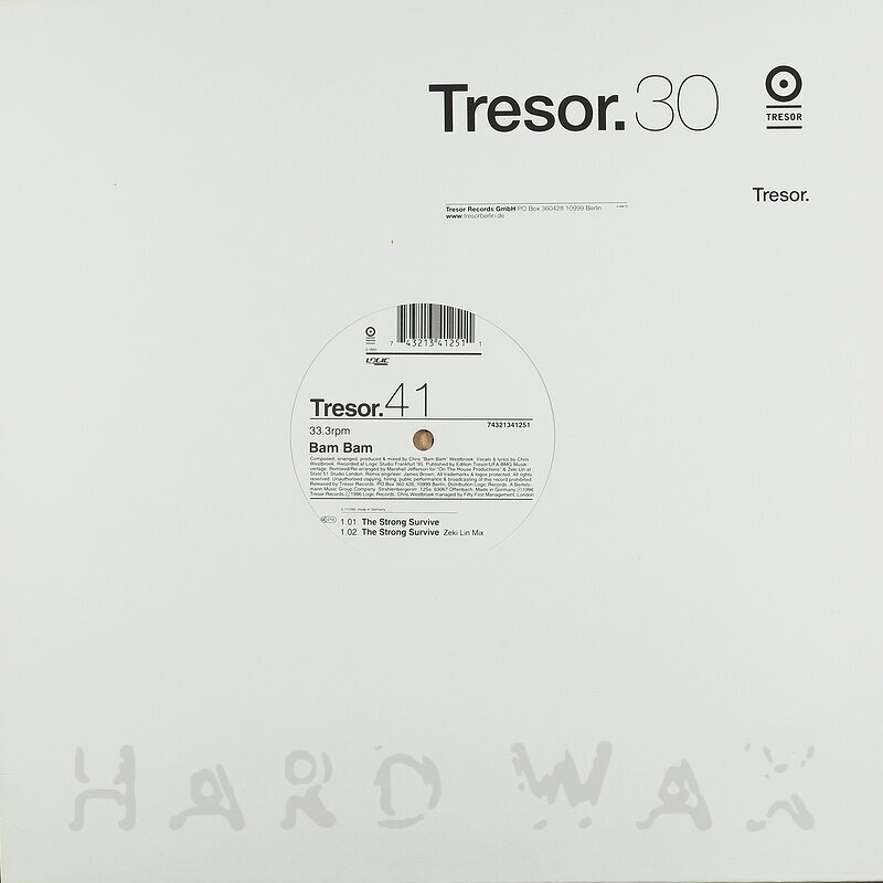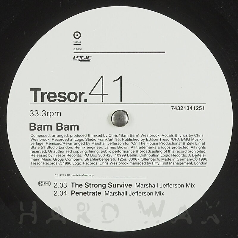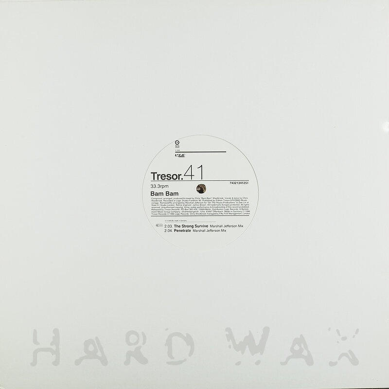 12"—12" € 25Tresor 041Label CatalogBam Bam: The Strong SurviveWarehouse find, vg+ A1 The Strong Survive A2 The Strong Survive (Zeki Lin Mix) B1 The Strong Survive (Marshall Jefferson Mix) B2 Penetrate (Marshall Jefferson Mix)
