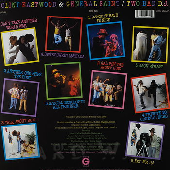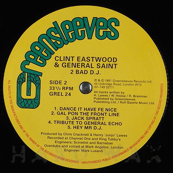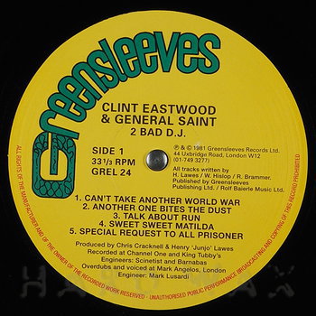LP— out of stockGreensleeves 24Reggae / A25Clint Eastwood & General Saint: Two Bad DJDeadly DJ Album album from 1981 A1 Can't Take Another World War A2 Another One Bites The Dust A3 Talk About Run A4 Sweet Sweet Matilda A5 Special Request To All Prisoner B1 Dance It Have Fe Nice B2 Gal Pon The Front Line B3 Jack Spratt B4 Tribute To General Echo B5 Hey Mr D.J.