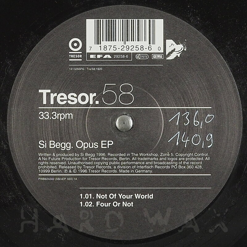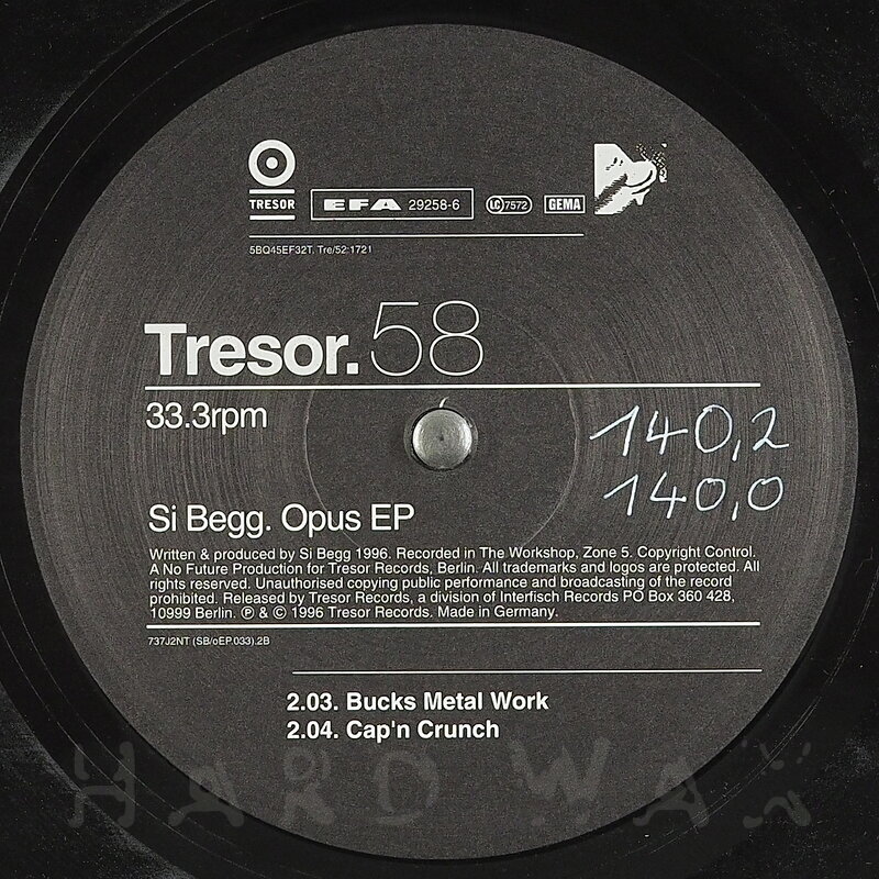 12"—12" € 20Tresor 058Label CatalogSi Begg: Opus EPClonky metallic reduced Techno EP, warehouse find, nm, wol A1 Not Of Your World A2 Four Or Not B1 Bucks Metal Work B2 Cap'n Crunch