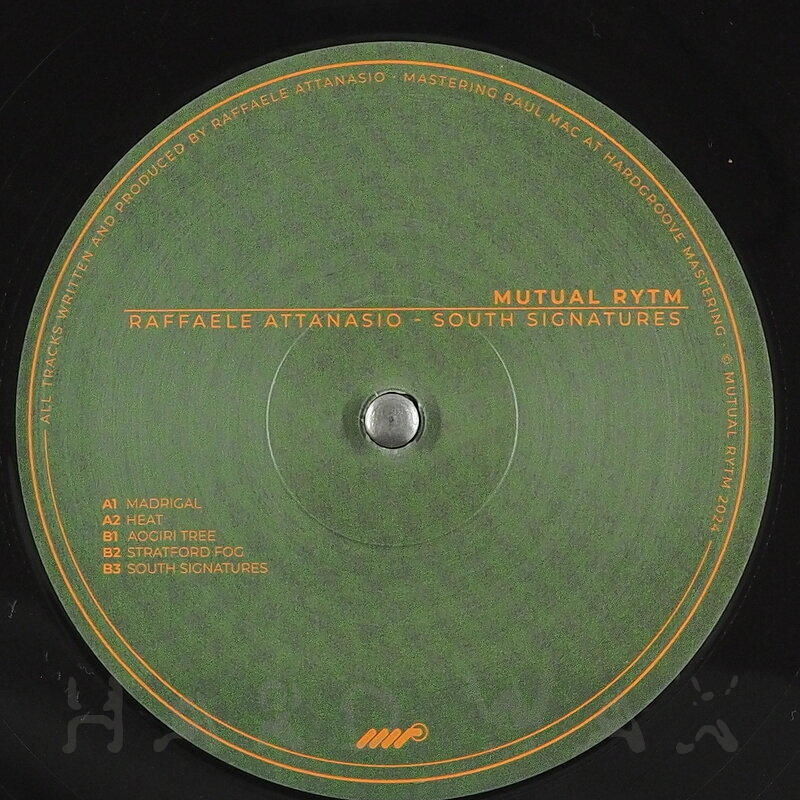 EP—EP € 14Mutual Rytm 021Label CatalogRaffaele Attanasio: South SignaturesAnthemic percussive big room Techno EP *re-press w/ black inner sleeve A1 Madrigal A2 Heat B1 Aogiri Tree B2 Stratford Fog B3 South Signatures