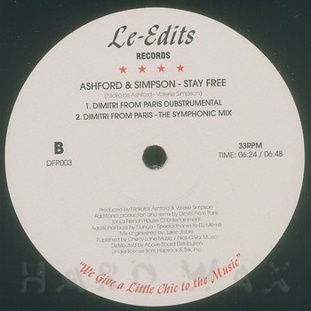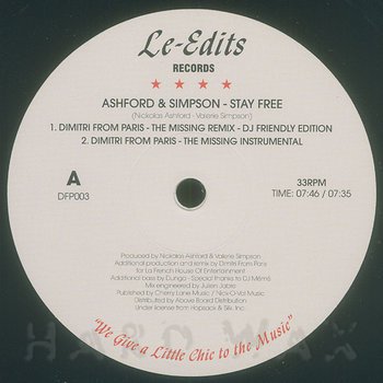 12"— out of stockLe Edits DFP 003DiscoAshford & Simpson: Stay Free - Dimitri From Paris Mixes1979 Disco fully remixed, expanded, retreated & presented in full DJ versions A1 Stay Free (Dimitri From Paris The Missing Remix DJ Friendly Edition) A2 Stay Free (Dimitri From Paris Remix Instrumental) B1 Stay Free (Dimitri From Paris Dubstramental) B2 Stay Free (Dimitri From Paris The Symphonic Mix)