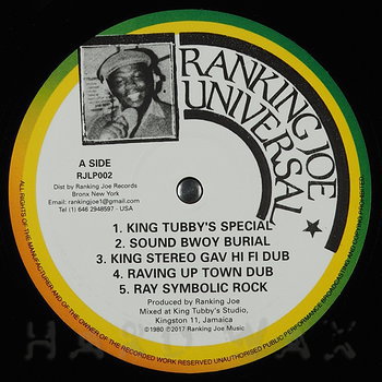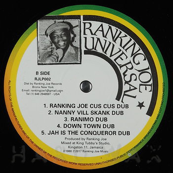 LP— out of stockRanking Joe LP 002Reggae / A10King Tubby: King At The ControlProper reissue of tuff Roots Radics biz at Channel One A1 King Tubby's Special A2 Sound Bwoy Burial A3 King Stereo Gav Hi Fi Dub A4 Raving Up Town Dub A5 Ray Symbolic Rock B1 Ranking Joe Cus Cus Dub B2 Nanny Vill Skank Dub B3 Ranimo Dub B4 Down Town Dub B5 Jah Is The Conqueror Dub