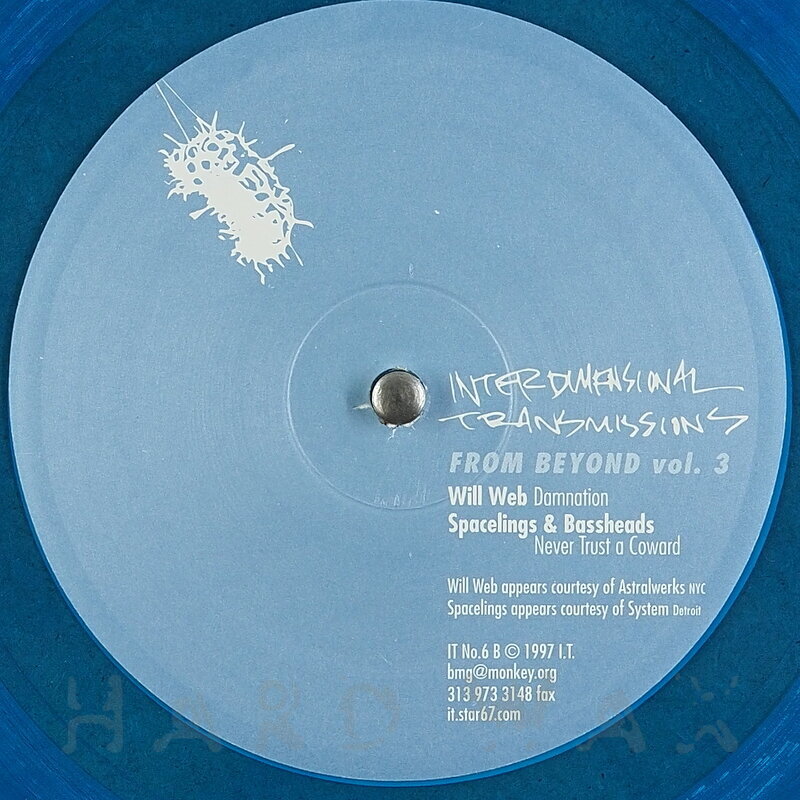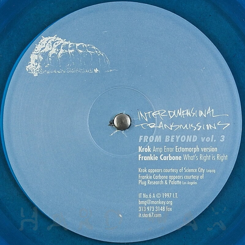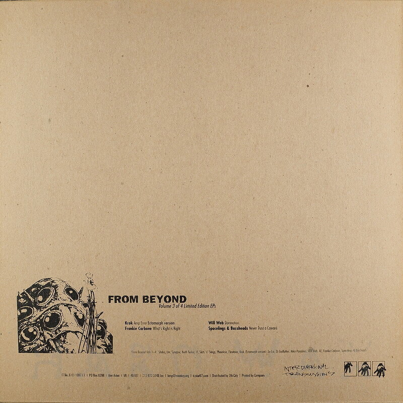 12"—12" € 40Interdimensional Transmissions 06Label CatalogVarious Artists: From Beyond Vol. 3Warehouse find, mint A1 Krok– Amp Error (Ectomorph Version) A2 Unknown Artist– Loop 1 A3 Unknown Artist– Loop 2 A4 Frankie Carbone– What's Right Is Right A5 Unknown Artist– Loop 3 B1 Unknown Artist– Loop 4 B2 Will Web– Damnation B3 Spacelings & Bassheads– Never Trust A Coward B4 Unknown Artist– Loop 5