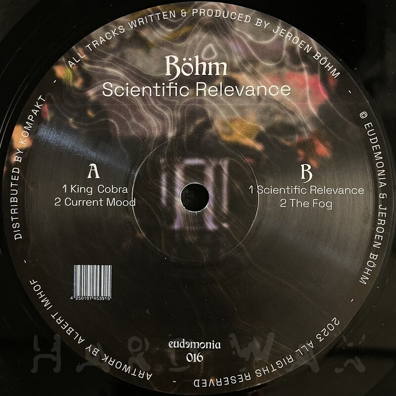 12"— out of stockEudemonia 016Label CatalogBöhm: Scientific RelevanceEarly 90s reminiscent, dreamy Acid Breakbeat EP A1 King Cobra A2 Current Mood B1 Scientific Relevance B2 The Fog