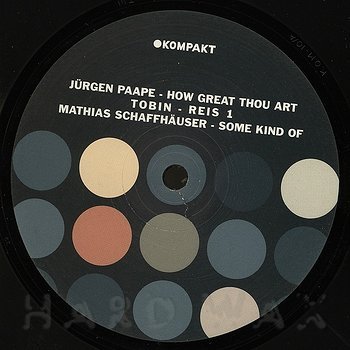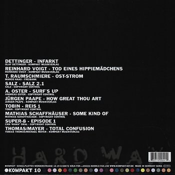 Do LP— out of stockKompakt 010Label CatalogVarious Artists: Kompakt Total 1Kompakt in full effect - exclusive tracks from the Kompakt family A1 Dettinger: Infarkt A2 Reinhard Voigt: Tod eines Hippiemädchens A3 T.Raumschmiere: Ost-Strom B1 Salz: Salz 2.1 B2 A. Oster: Surf's Up C1 Jürgen Paape: How Great Thou Art C2 Tobin: Reis Eins C3 Mathias Schaffhäuser: Some Kind Of D1 Super 8: Episode 1 D2 Thomas / Mayer: Total Confusion