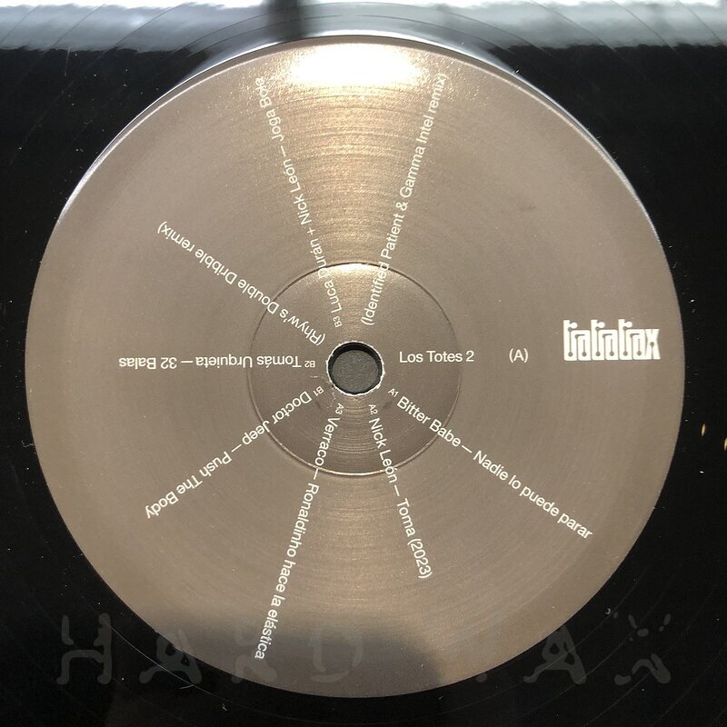 EP—EP € 17TraTraTrax LT 2Label CatalogVarious Artists: Los Totes 2Label mini-compilation between Reggaeton tinged, big room blends & reduced, twisted Techno DJ tools A1 Bitter Babe: Nadie Lo Puede Parar A2 Nick León: Toma (2023) A3 Verraco: Ronaldinho Hace La Plástica B1 Doctor Jeep: Push The Body B2 Tomás Urquieta: 32 Balas (Rhyw’ Double Dribble Remix) B3 Luca Durán & Nick León: Joga Bola (Identified Patient & Gamma Intel Remix)