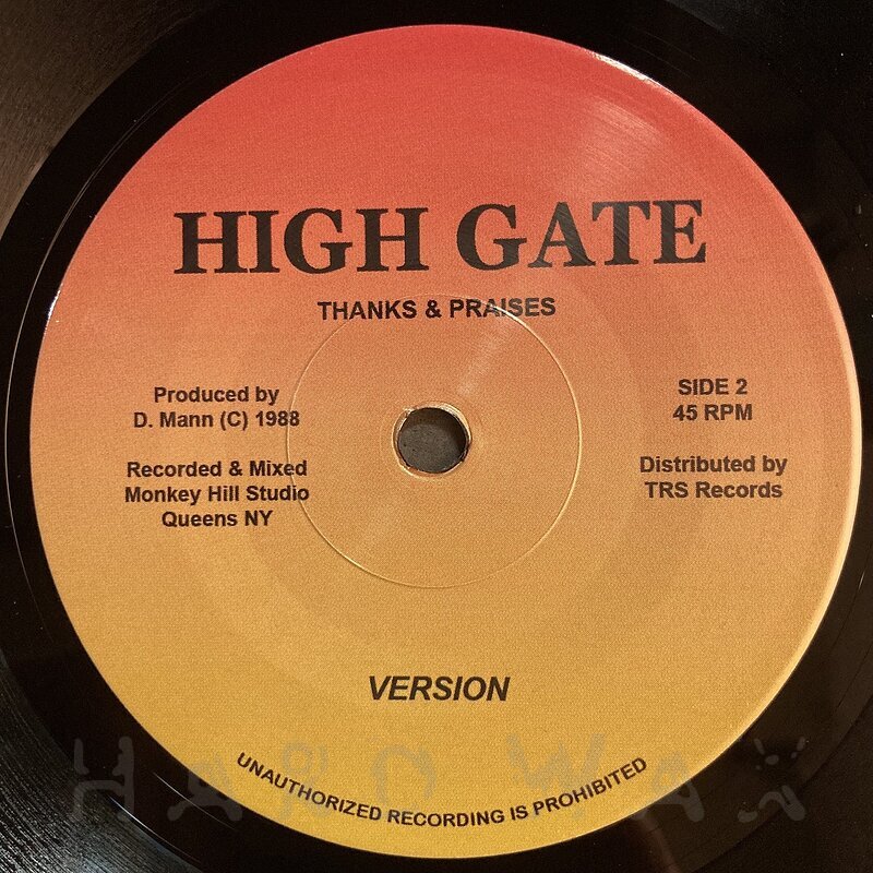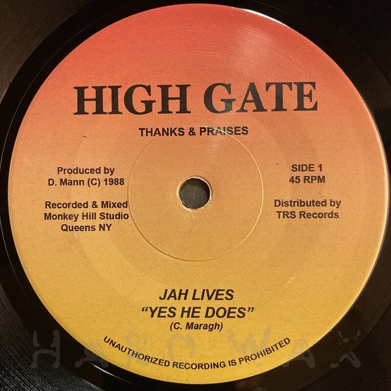 7"—7" € 14High Gate TRS HG 1Reggae / C8Thanks & Praises: Jah Lives Yes He DoesHeavy, obscure, late 80s rarity first time w/ its version A1 Jah Lives Yes He Does B1 Version