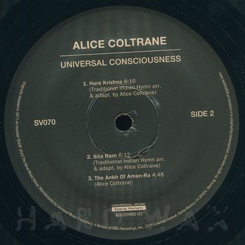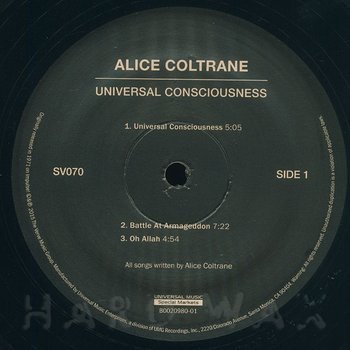 Originally released on Impulse! in 1971, Universal Consciousness is a major turning point in Alice Coltrane's momentous career. While her previous albums pushed the limits of spiritual free jazz and featured much of her late husband's band, Universal Consciousness expands the harpist / pianist's compositional palette with organ and strings (working with Ornette Coleman).