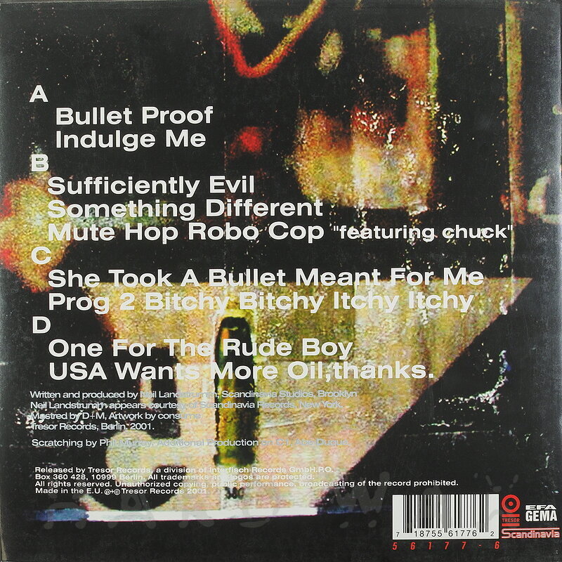 Do LPMP3AIFFDo LP € 40Tresor 177Label CatalogNeil Landstrumm: She Took A Bullet Meant For MeWarehouse find, nm A1 Bullet Proof A2 Indulge Me B1 Sufficiently Evil B2 Something Different B3 Mute Hop Robo Cop Feat. Chuck C1 She Took A Bullet Meant For Me C2 Prog 2 Bitchy Bitchy Itchy Itchy D1 One For The Rude Boy D2 USA Wants More Oil, Thanks.Do LPMP3AIFFMP3AIFF11 AIFFs € 12.511 MP3s € 10Tresor Records TRESOR177Neil Landstrumm: She Took A Bullet Meant For MeWarehouse find, nm Bullet Proof5:38AIFF € 1.75MP3 € 1.25 Indulge Me5:29AIFF € 1.75MP3 € 1.25 Mute Hop Robo Cop3:26AIFF € 1.75MP3 € 1.25 She Took A Bullet Meant For Me5:20AIFF € 1.75MP3 € 1.25 Prog 2 Bitchy Bitchy Itchy Itchy5:39AIFF € 1.75MP3 € 1.25 Glamourama5:40AIFF € 1.75MP3 € 1.25 Something Different3:56AIFF € 1.75MP3 € 1.25 Sufficiently Evil2:14AIFF € 1.25MP3 € 1.00 One For The Rude Boy5:20AIFF € 1.75MP3 € 1.25 USA Wants More Oil, Thanks6:19AIFF € 1.75MP3 € 1.25 Wax Melts Me4:11AIFF € 1.75MP3 € 1.25