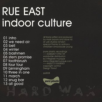 CD— out of stockPure Plastic 038 CDLabel CatalogRue East: Indoor CultureMark Broom & Dave Hill produced timeless Techno; warehouse find - mint copies 01 Intro 02 We Need Air 03 Bell 04 Winter 05 Bashmen 06 Stern Promise 07 Toothbrush 08 Four Four 09 Birmingham 10 Three In One 11 March 12 Snug Bar 13 All Good