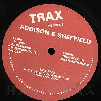 12"— out of stockTrax 189Label CatalogAddison & Sheffield: Holy CowOriginal pressing. Dean Anderson prod. A1 Holy Cow B1 Holy Cow (Extended)
