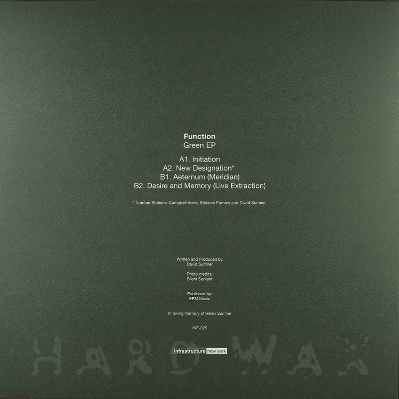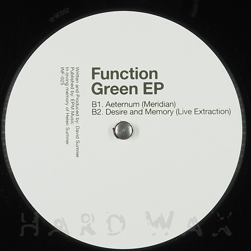 12"— out of stockInfrastructure 025Label CatalogFunction: Green EPPure, dreamy, atmospheric Techno landscapes A1 Initiation A2 New Designation B1 Aeternum Meridian B2 Desire and Memory Live Extractio