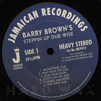 LP— out of stockJamaican Recordings LP 12Reggae / A42Barry Brown: Steppin Up Dub WiseLost dubs from King Tubby, apparently A1 Moneywise Dub A2 Why Fight The Dub A3 Dub Confusion A4 Leggo Jah Jah Dub A5 A Lonely Dub Song A6 Step Inna Dub B1 Meditate & Concentrate B2 Struggle Some Dub B3 Love Is The Dub B4 Dub Creation B5 Rocky Rocky Dub B6 Dub Can't Come