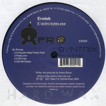 12"— out of stockAfrosyntrix 002Label CatalogErotek: E:/ectro-bytes.exe10 short trks of essential Detroit sounds from booty to deep techno to minimal A1 Prompt A2 Computer-Acided Poetic Funk A3 FreqU.com A4 DOS Foot A5 Ctrl+Alt+Delete B1 Safe Mode B2 Blinking Cursor B3 Any Key To Continue B4 DOS Boot B5 Refresh