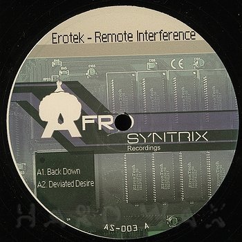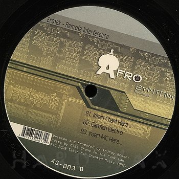 12"— out of stockAfrosyntrix 003Label CatalogErotek: Remote InterferenceAndray Brown & Mike Grant prod. multi style Detroit techno tracks A1 Back Down A2 Deviated Desire B1 Insert Chant Here B2 Carmen Electro B3 Insert MC Here