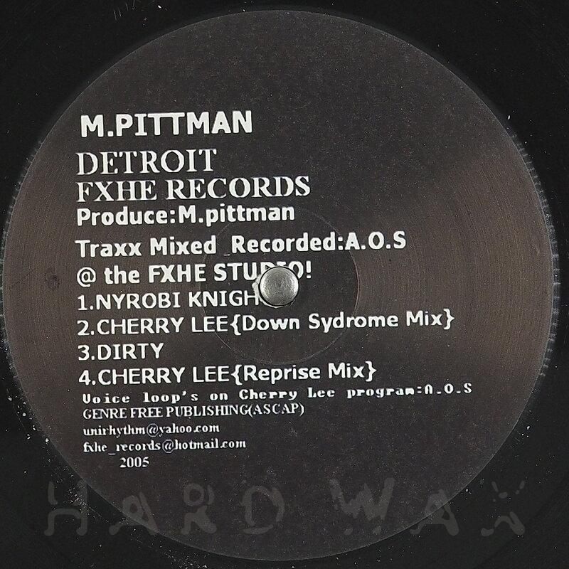 12"—12" € 20FXHE M. PittmanLabel CatalogMarcellus Pittman: Nyrobi KnightDark late night hypnotic & percussive Detroit house A1 Nyrobi Knight A2 Cherry Lee (Down Syndrome Mix) B1 Dirty B2 Cherry Lee (Reprise Mix)