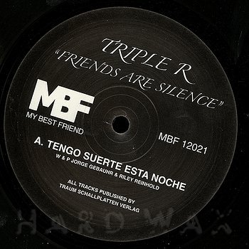 Do 12"— out of stockMy Best Friend 12021Label CatalogTriple R: Friends Are SilenceFrom floatin' blue atmospheric to subtle 80s disco-esque tech house tunes A1 Jorge Gebauhr & Riley Reinhold: Tengo Esta Noche B1 Jorge Gebauhr & Riley Reinhold: Six Sick Torros C1 Remute & Riley Reinhold: Polyester C2 Emanuel Geller & Riley Reinhold: Beauty Needs No Wings D1 Steve Barnes & Riley Reinhold: Someday