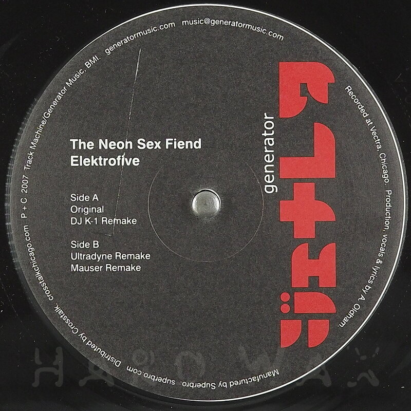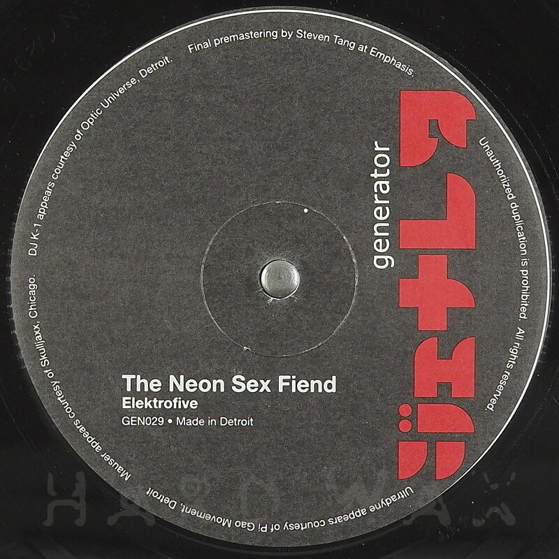 12"—12" € 20Generator 029Label CatalogThe Neon Sex Fiend: ElektrofiveAlan Oldham prod. electro techno. Keith Tucker & Ultradyne remixes, warehouse find, nm A1 Original A2 DJ K-1 Remake B1 Ultradyne Remake B2 Mauser Remake