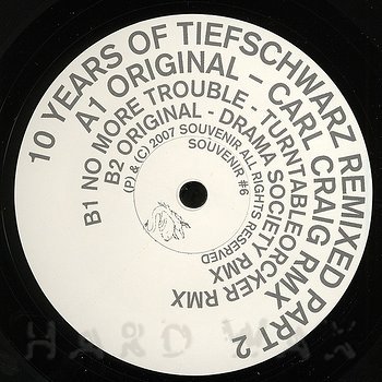 12"— out of stockSouvenir 006Label CatalogTiefschwarz: 10 Years Of Tiefschwarz Blackmusik #2 RemixesTech house w/ dance pop appeal A1 Original (Carl Craig Remix) B1 No More Trouble (Turntablerocker Remix) B2 Original (Drama Society Remix)