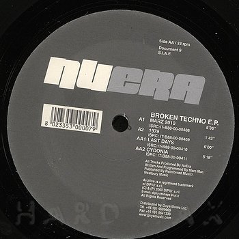 12"— out of stockArchive Document 009Label CatalogNu Era: Broken Techno EPNeo Detroit house/techno A1 Marz 2010 A2 1979 B1 Last Days B2 Cydonia