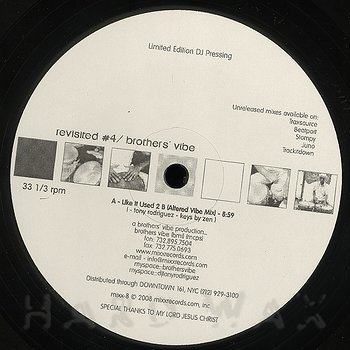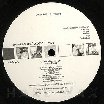 12"— out of stockMixx 008Label CatalogBrothers’ Vibe: Revisited #4Tony Rodriguez prod. DJ tool house tracks in a Larry Heard vain A1 Like It Used 2 B (Altered Vibe Mix) B1 The Difference