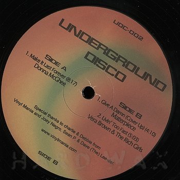 12"— out of stockUnderground Disco Classics 002Label CatalogDonna McGhee: Make It Last ForeverRe-issue of disco classics A1 Make It Last Forever B1 Give A Damn (Cover Up) B2 Livin’ Too Fast