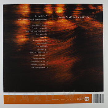 Do LP— out of stockWarp LP 207Label CatalogBrian Eno: Small Craft On A Milk SeaReissue of cinematic Ambient Electronica album (w/ download code) A1 Emerald And Lime A2 Complex Heaven A3 Small Craft On A Milk Sea A4 Flint March B1 Horse B2 2 Forms Of Anger B3 Bone Jump B4 Dust Shuffle C1 Paleosonic C2 Slow Ice, Old Moon C3 Lesser Heaven C4 Calcium Needles D1 Emerald And Stone D2 Written, Forgotten D3 Late Anthropocene