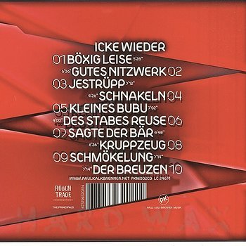 CD— out of stockPaul Kalkbrenner Musik 002 CDLabel CatalogPaul Kalkbrenner: Icke Wieder2011 album 01 Böxig Leise 02 Gutes Nitzwerk 03 Jestrüpp 04 Schnakeln 05 Kleines Bubu 06 Des Stabes Reuse 07 Sagte Der Bär 08 Kruppzeug 09 Schmökelung 10 Der Breuzen