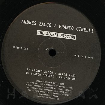 12"— out of stockGreener 003Label CatalogAndrés Zacco / Franco Cinelli: The Secret MissionStraight ahead techno house track A1 Andrés Zacco: After That B1 Franco Cinelli: Pattern 02