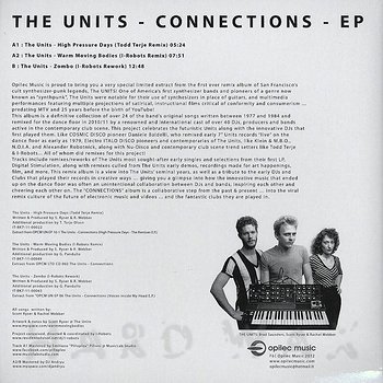 12"— out of stockOpilec Music 011Label CatalogThe Units: Connections EPSan Francisco Synth Post Punk legends reworked to good effect A1 High Pressure Days (Todd Terje Remix) A2 Warm Moving Bodies (I-Robots Remix) B1 Zombo (I-Robots Rework)