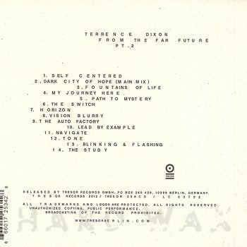 CD— out of stockTresor 256 CDLabel CatalogTerrence Dixon: From The Far Future Pt. 2Classy, futuristic Ambient Techno/ Detroit Techno album; CD w/ exclusive tracks 01 Self Centered 02 Dark City Of Hope (Main Mix) 03 Fountains Of Life 04 My Journey Here 05 Path To Mystery 06 The Switch 07 Horizon 08 Vision Blurry 09 The Auto Factory 10 Lead By Example 11 Navigate 12 Tone 13 Blinking & Flashing 14 The Study