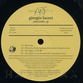 12"— out of stockDeepartsounds 007Label CatalogGiorgio Luceri: Pherenike EPAtmospheric House jackers A1 Pherenike A2 Pherenike (Nick Anthony Simoncino's Paradise Mix) B1 The Nights At 118 4B B2 The Nights At 118 4B (Marcello Napoletano Mix)