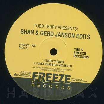 12"— out of stockFreeze 1305Label CatalogTodd Terry: Shan & Gerd Janson EditsClassic TT tracks in outsourced updates A1 I Need Ya (Edit) A2 Funky Brass (UK Mix Re-Fix) B1 Searchin (Edit) B2 Logan's Running (Edit)