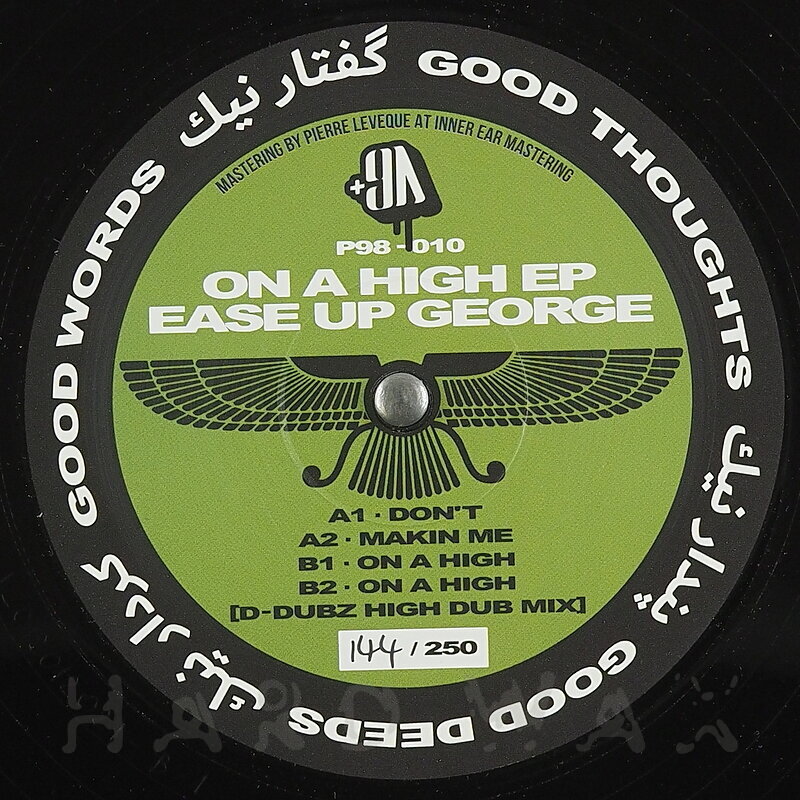 12"—12" € 18+98 Music 010Label CatalogEase Up George: On A High EPSoothing, atmospheric UKG tunes A1 Don ́t A2 Makin` Me B1 On A High B2 On a High (D-Dubz High Dub Mix)