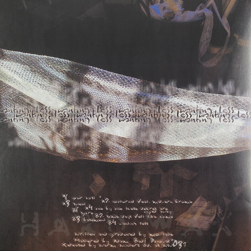 LP— out of stockWarm Winters Ltd. 037Label CatalogMu Tate: Wanting LessHallucinatory, weightless Ambient journey A1 Your Host A2 Nocturnal feat. Malvern Brume A3 Sweat A4 One By One These Desires Are Wiped Away B1 Spore B2 Some Days Felt Like Home B3 Basement