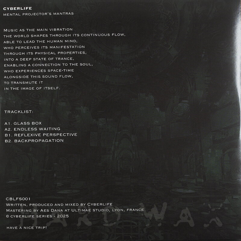 12"—12" € 17.5Cyberlife Series 001Label CatalogCyberlife: Mental Projectors MantrasFresh, deep to experimental, psychedelic halftime Techno / Drum & Bass hybrid trips A1 Glass Box A2 Endless Waiting B1 Reflexive Perspective B2 Backpropagation