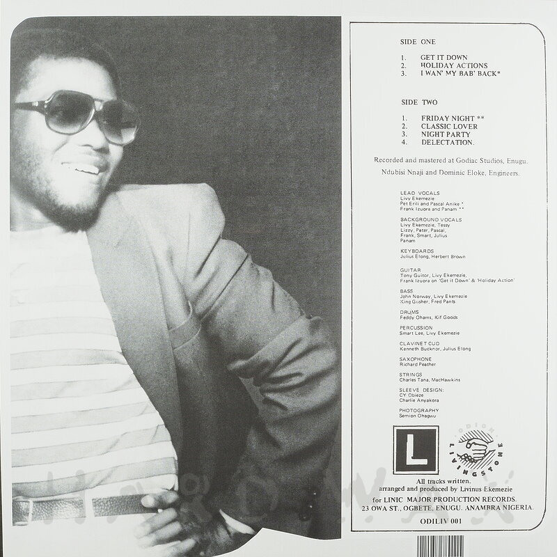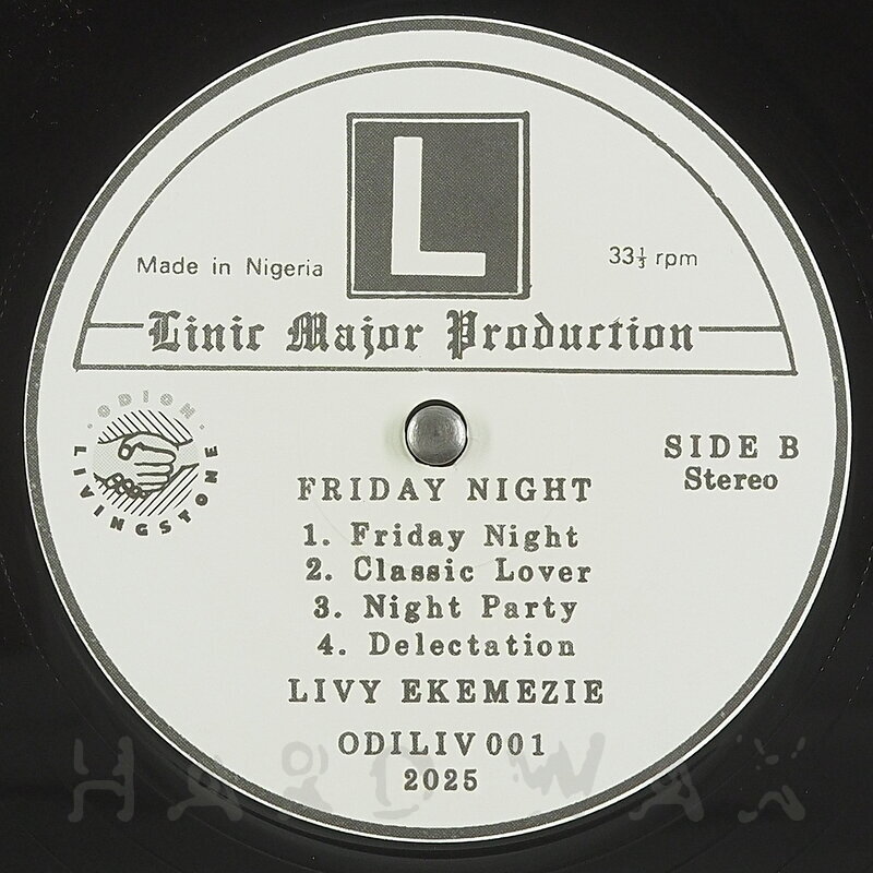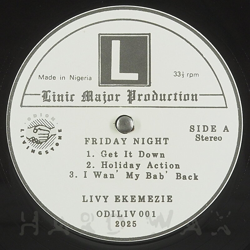 LP—LP € 36Odion Livingstone 001OuternationalLivy Ekemezie: Friday NightReissue of sought-after 80s Nigierian Disco gem A1 Get It Down A2 Holiday Action A3 I Wan' My Bab' Back B1 Friday Night B2 Classic Lover B3 Night Party B4 Delectation.