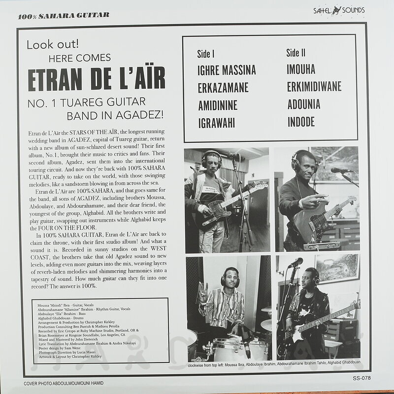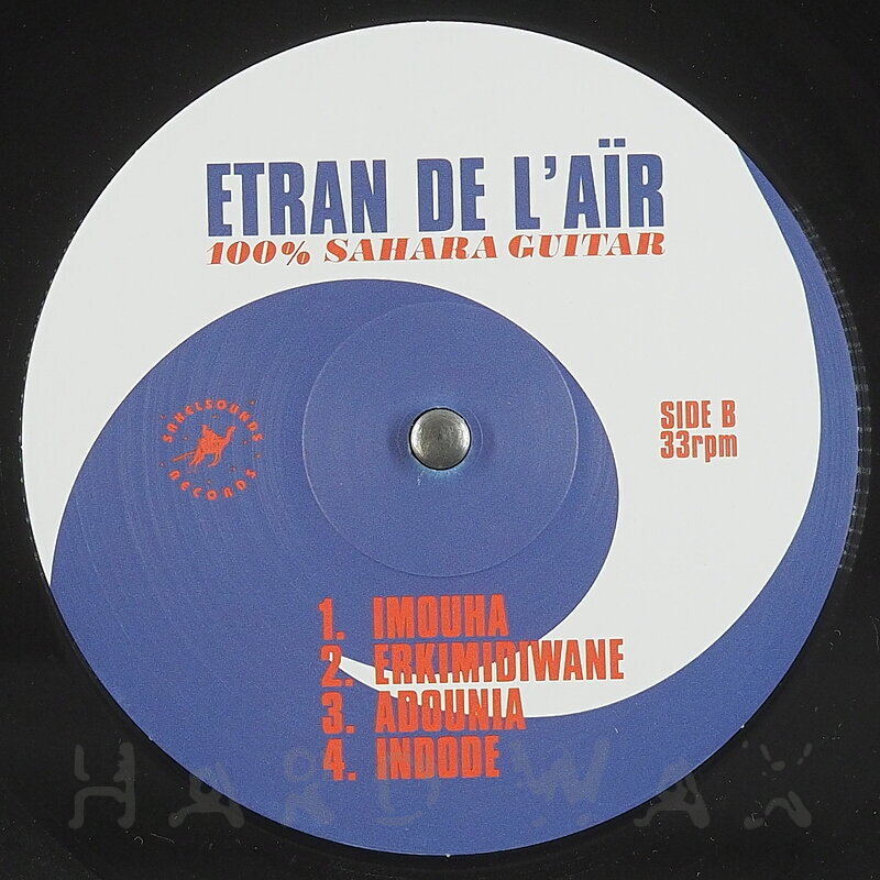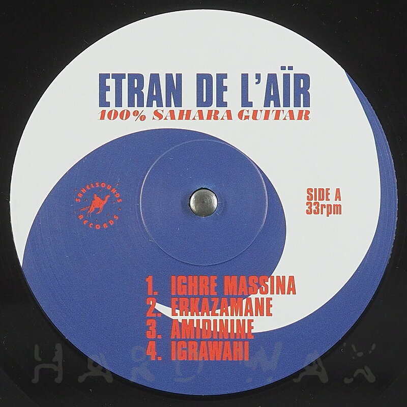 LP—LP € 34Sahel Sounds 078OuternationalEtran de L'Aïr: 100% Sahara GuitarBeautiful, complex & psychedelic multi-guitar sound layered North African Rock LP A1 Ighre Massina A2 Erkazamane A3 Amidinine A4 Igrawahi B1 Imouha B2 Erkimidiwane B3 Adounia B4 Indode
