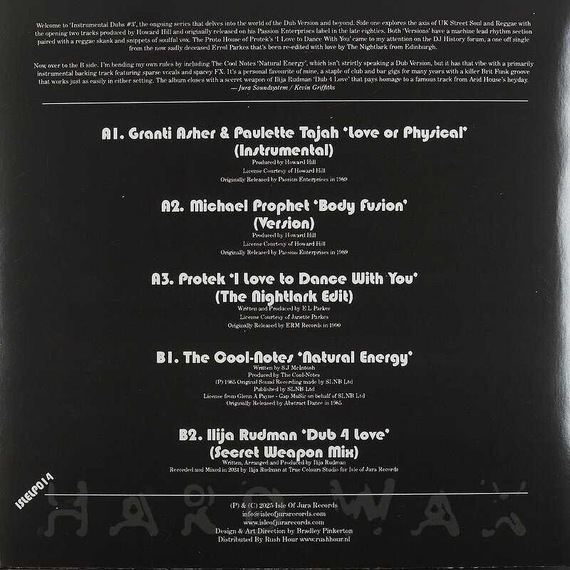 LP—LP € 27Isle Of Jura LP 014DiscoVarious Artists: Instrumental Dubs #3Selection of classy 80s UK Lovers Rock & Street Soul / Boogie instrumentals A1 Granti Asher Paulette Tajah: Love Or Physical Instrumental A2 Michael Prophet: Body Fusion Version A3 Protek: I Love To Dance With You The Nightlark B1 The Cool Notes: Natural Energy B2 Ilija Rudman: Dub 4 Love Secret Weapon